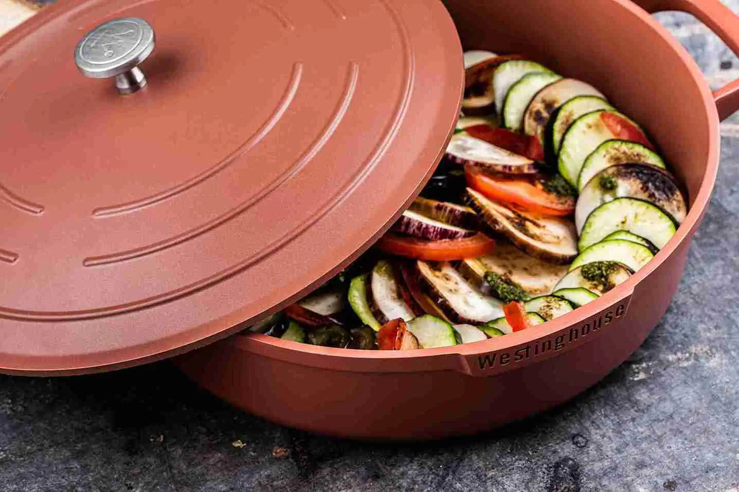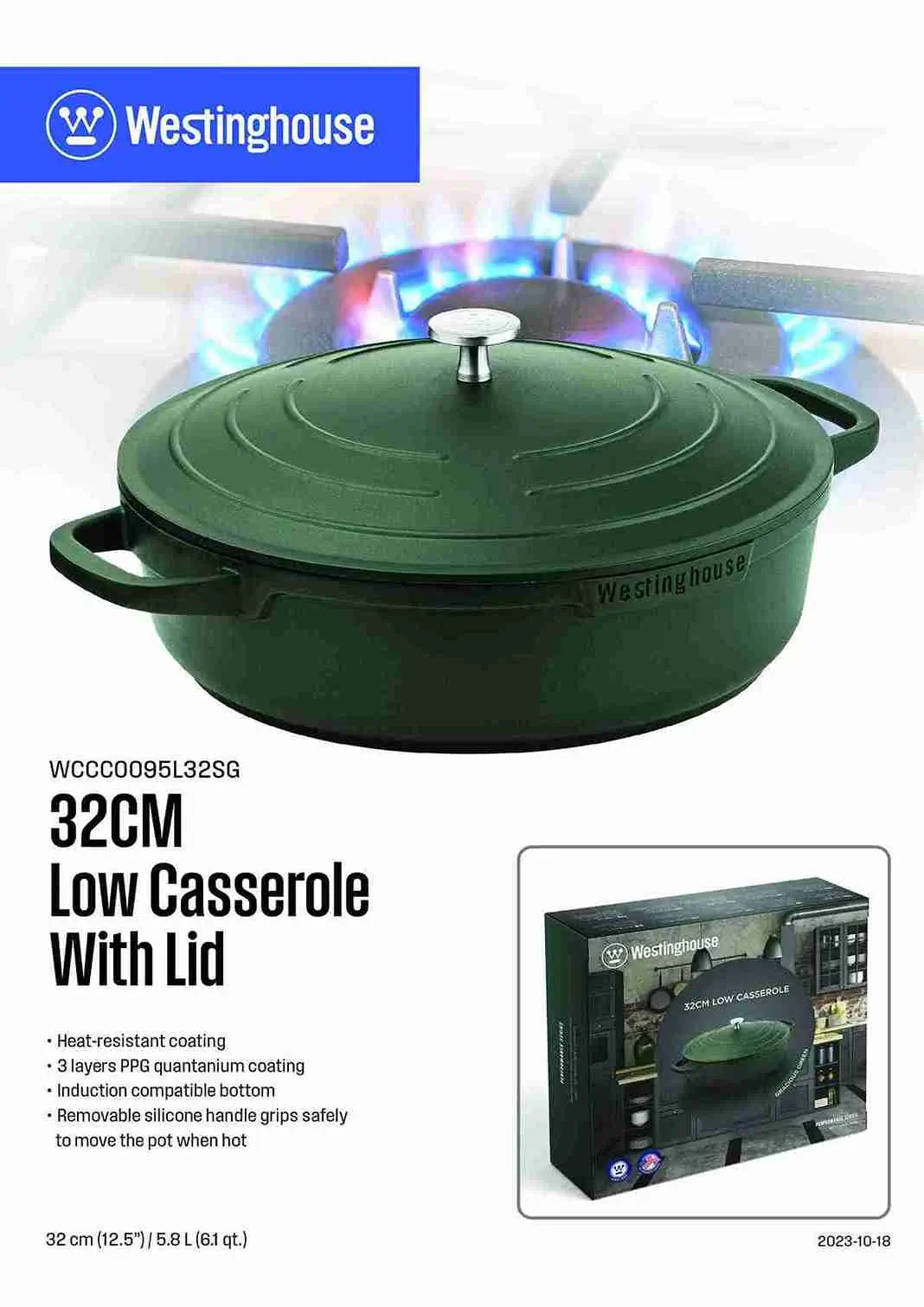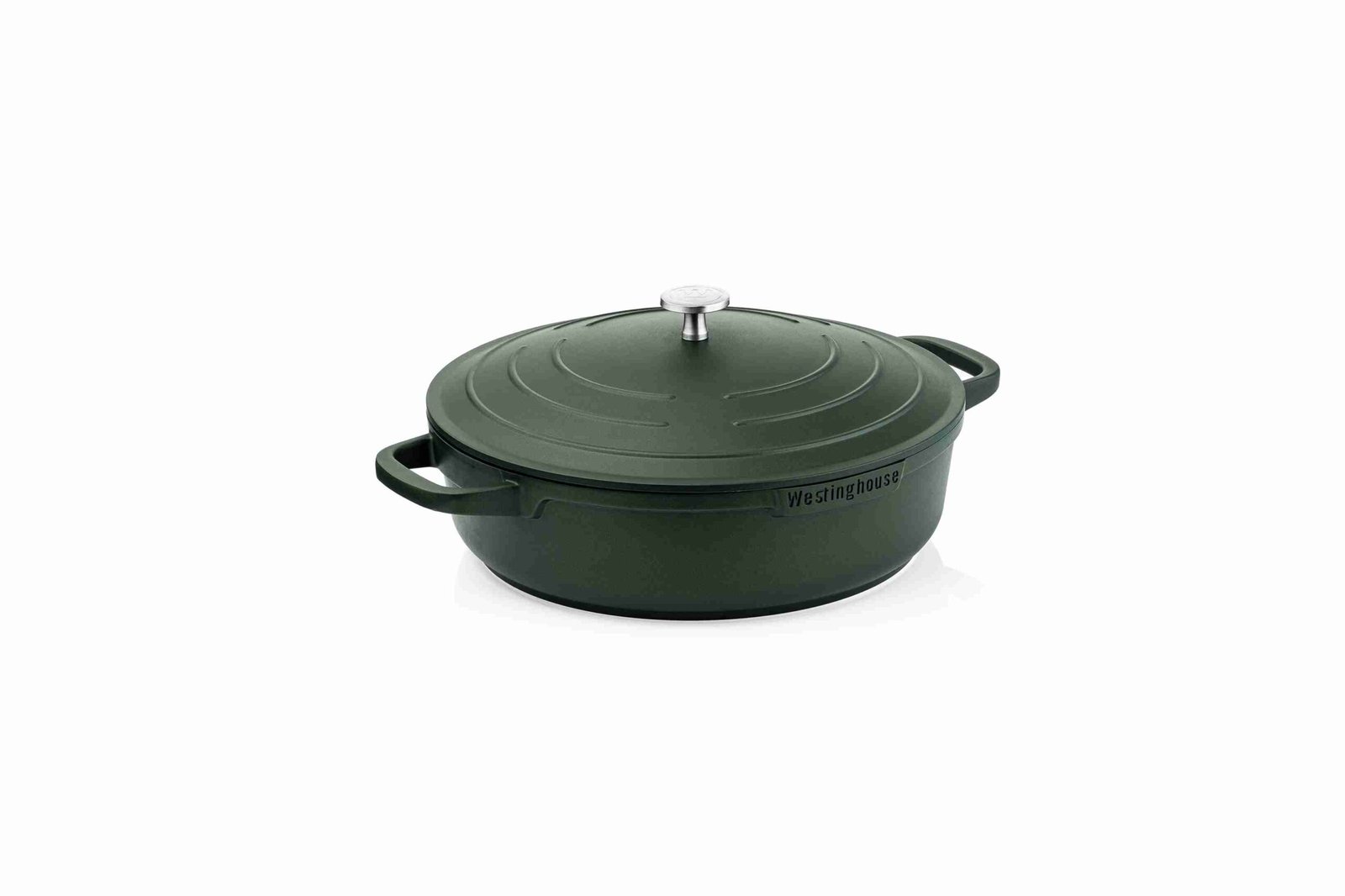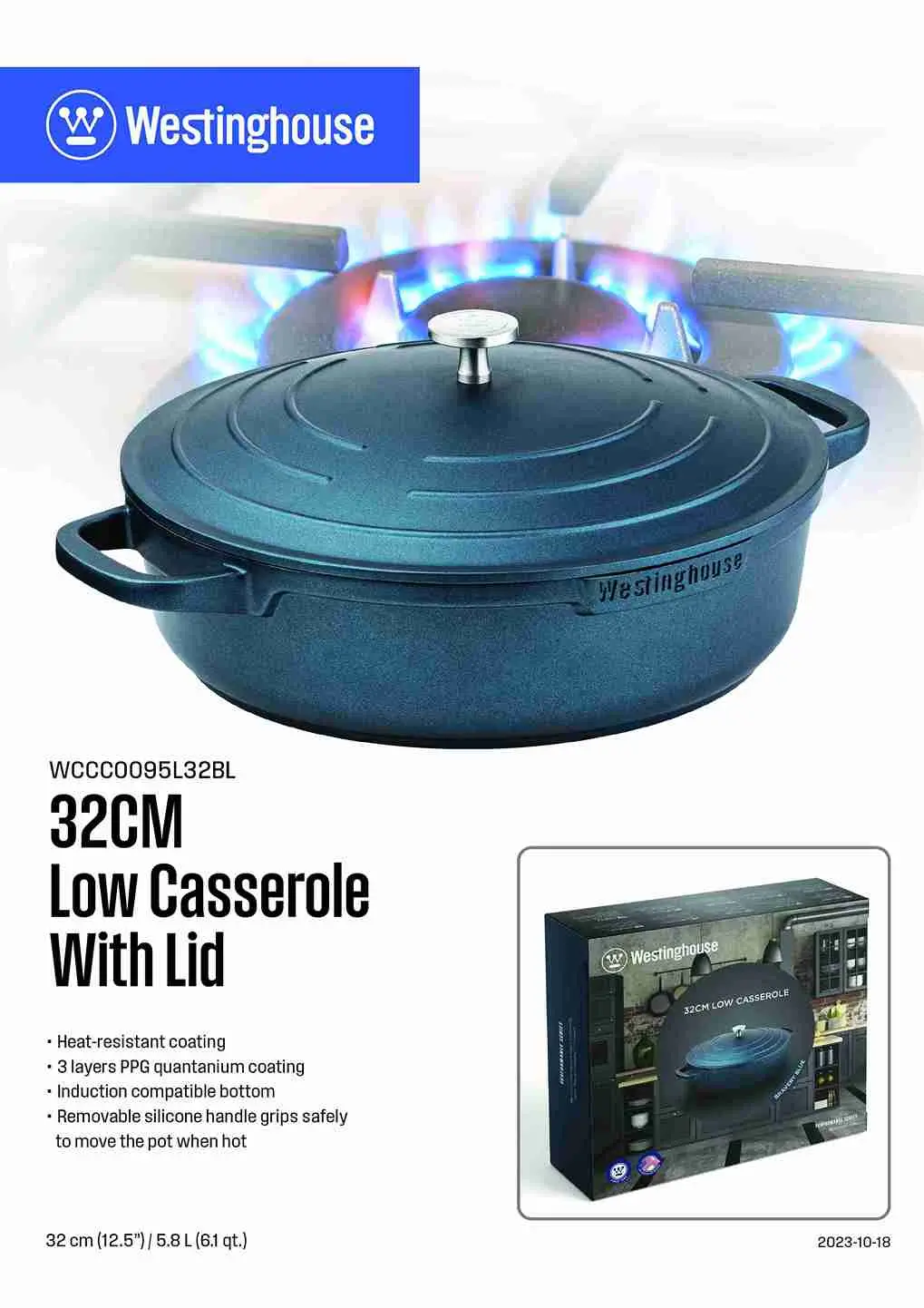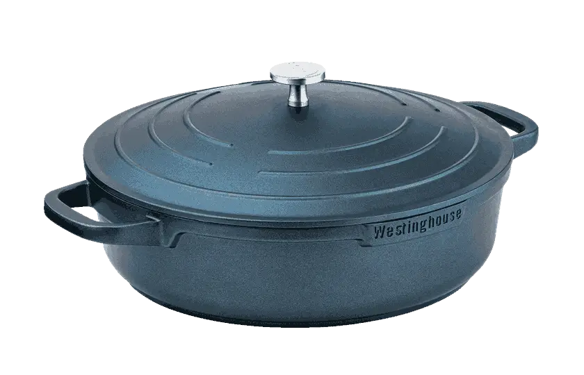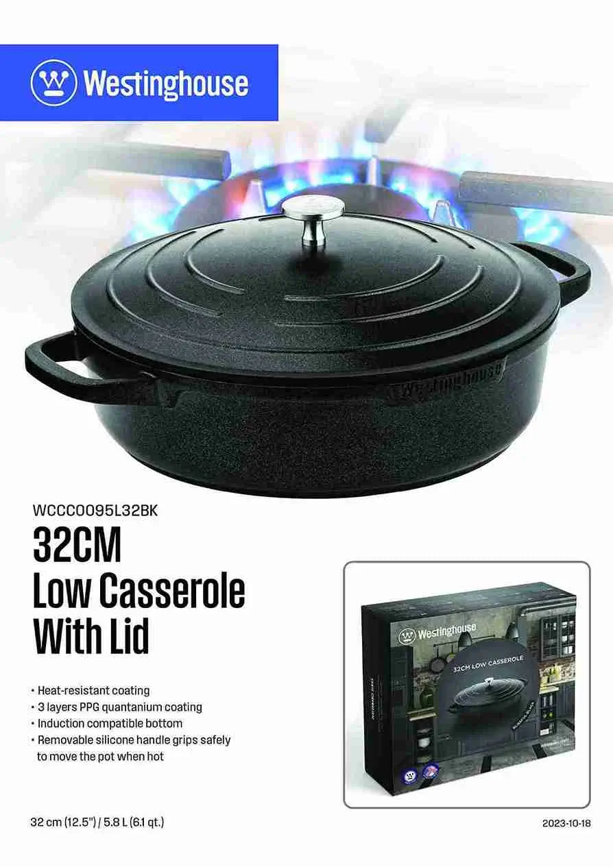Westinghouse 32cm low casserole with lid (5.8L) made from cast aluminium with a 3-layer PPG QuanTanium non-stick interior and heat-resistant exterior. Induction-ready, dishwasher safe, and oven safe up to 230°C ideal for family stews, sauces, and one-pan meals.
