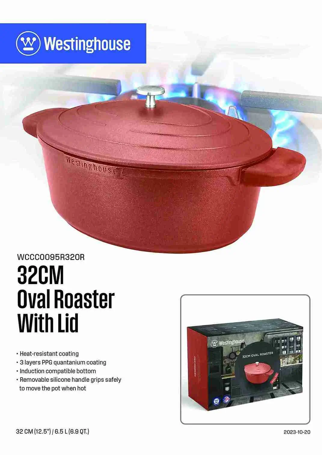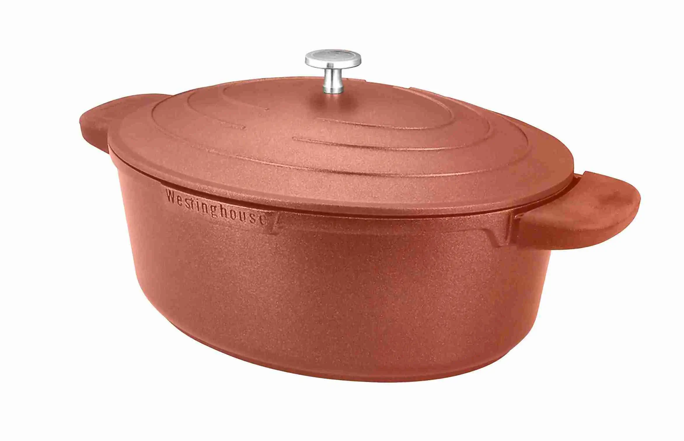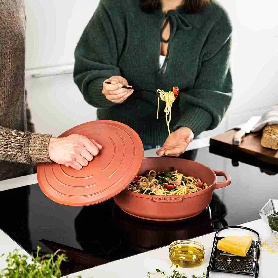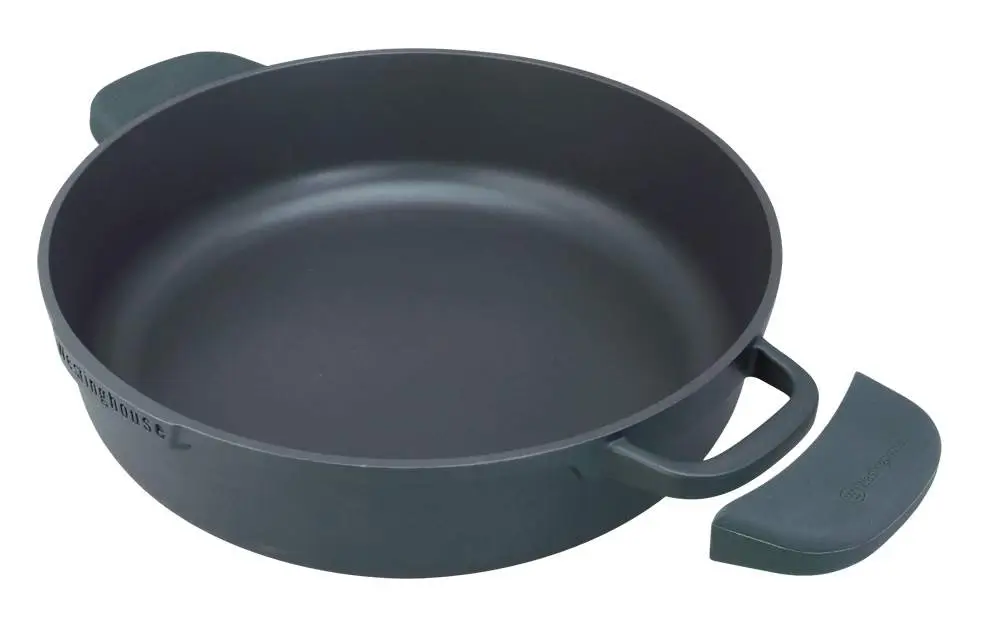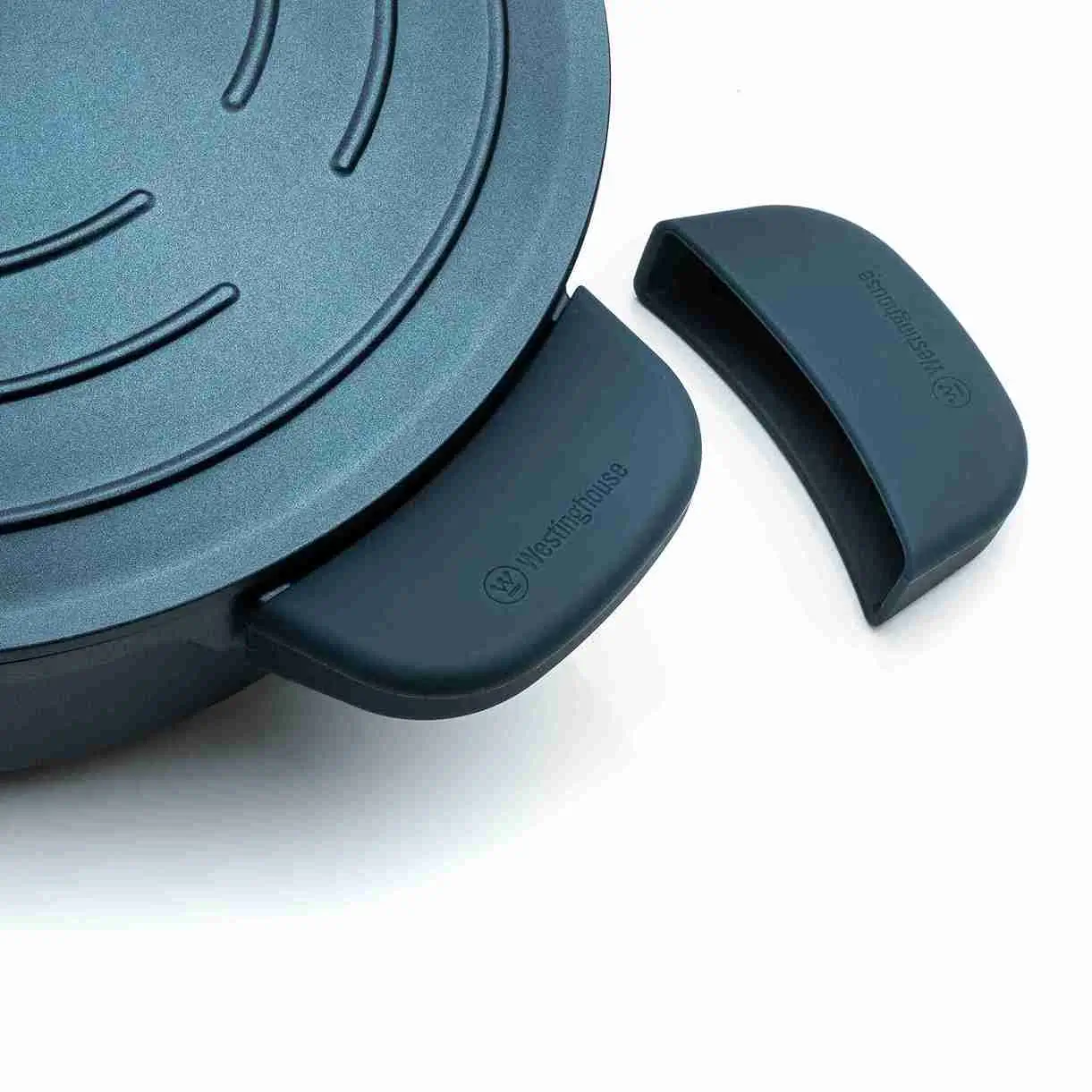 Westinghouse 32cm low casserole with lid (5.8L) made from cast aluminium with a 3-layer PPG QuanTanium non-stick interior and heat-resistant exterior. Induction-ready, dishwasher safe, and oven safe up to 230°C ideal for family stews, sauces, and one-pan meals.