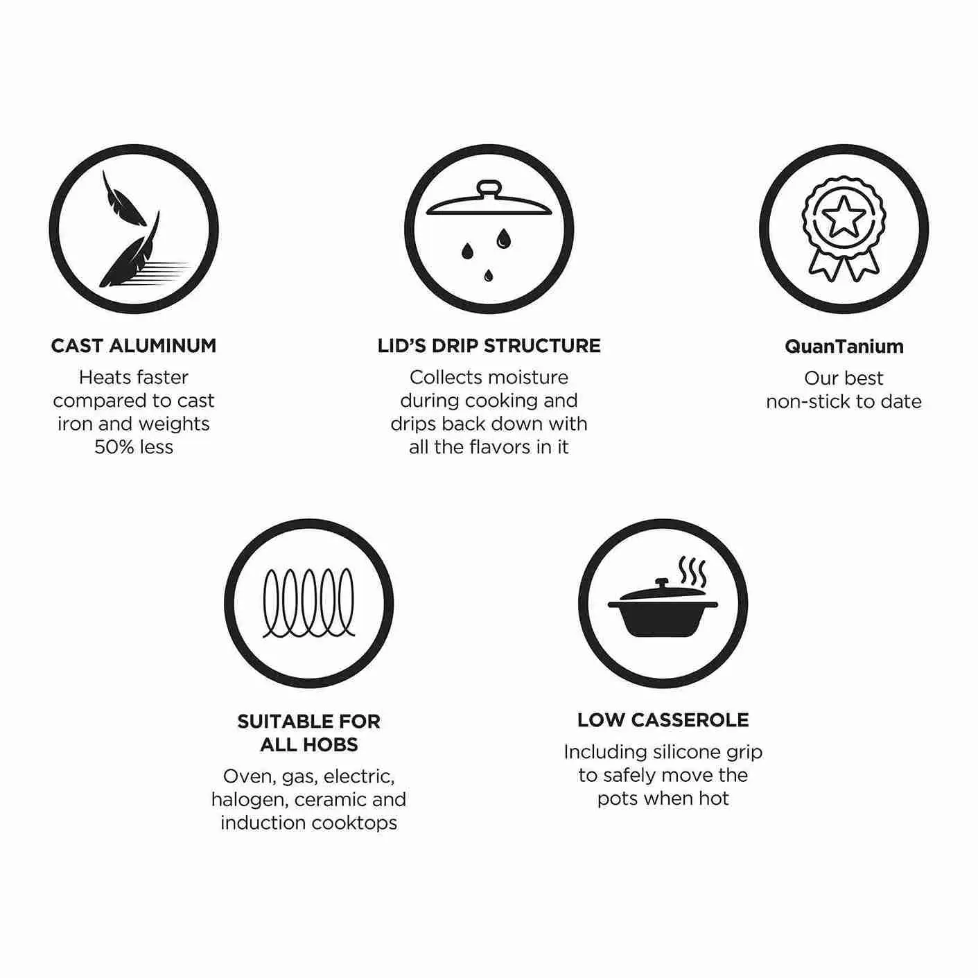 The cast aluminium body and matching cast aluminium lid are built for daily durability while staying easier to lift than heavier cookware materials. A heat-resistant exterior finish and a stainless-steel knob complete the look with a clean, premium touch.