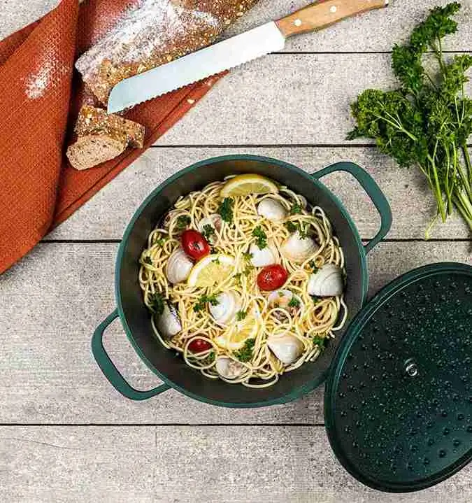 The 32cm diameter and 5.8L capacity give you the space to cook family portions without crowding—ideal for slow-simmered stews, sauces, and one-pot meals. Cast aluminium is designed for efficient heat conduction, helping food cook more evenly on the hob.