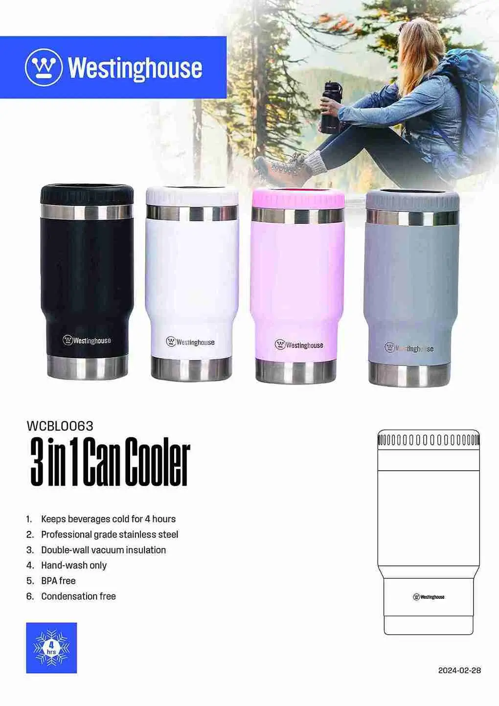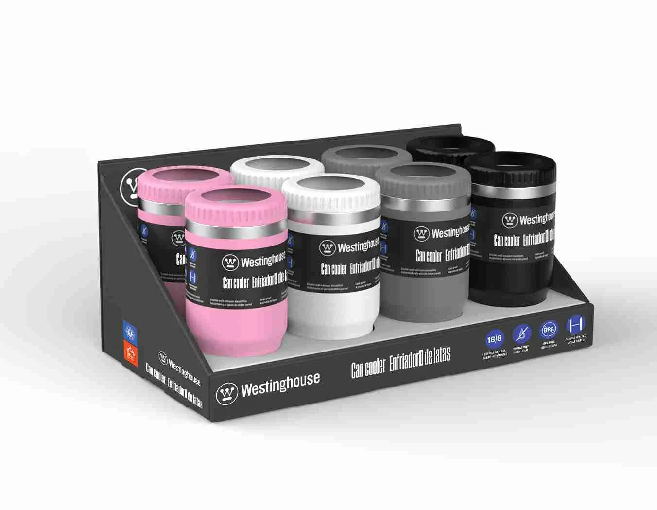Westinghouse 3-in-1 insulated can cooler with double-wall vacuum insulation to keep drinks cold for up to 4 hours, and a condensation-free exterior for a comfortable grip. Designed to fit cans and bottles with a built-in bottle opener, BPA-free, and available in 4 colors: Pink, White, Black, and Grey.