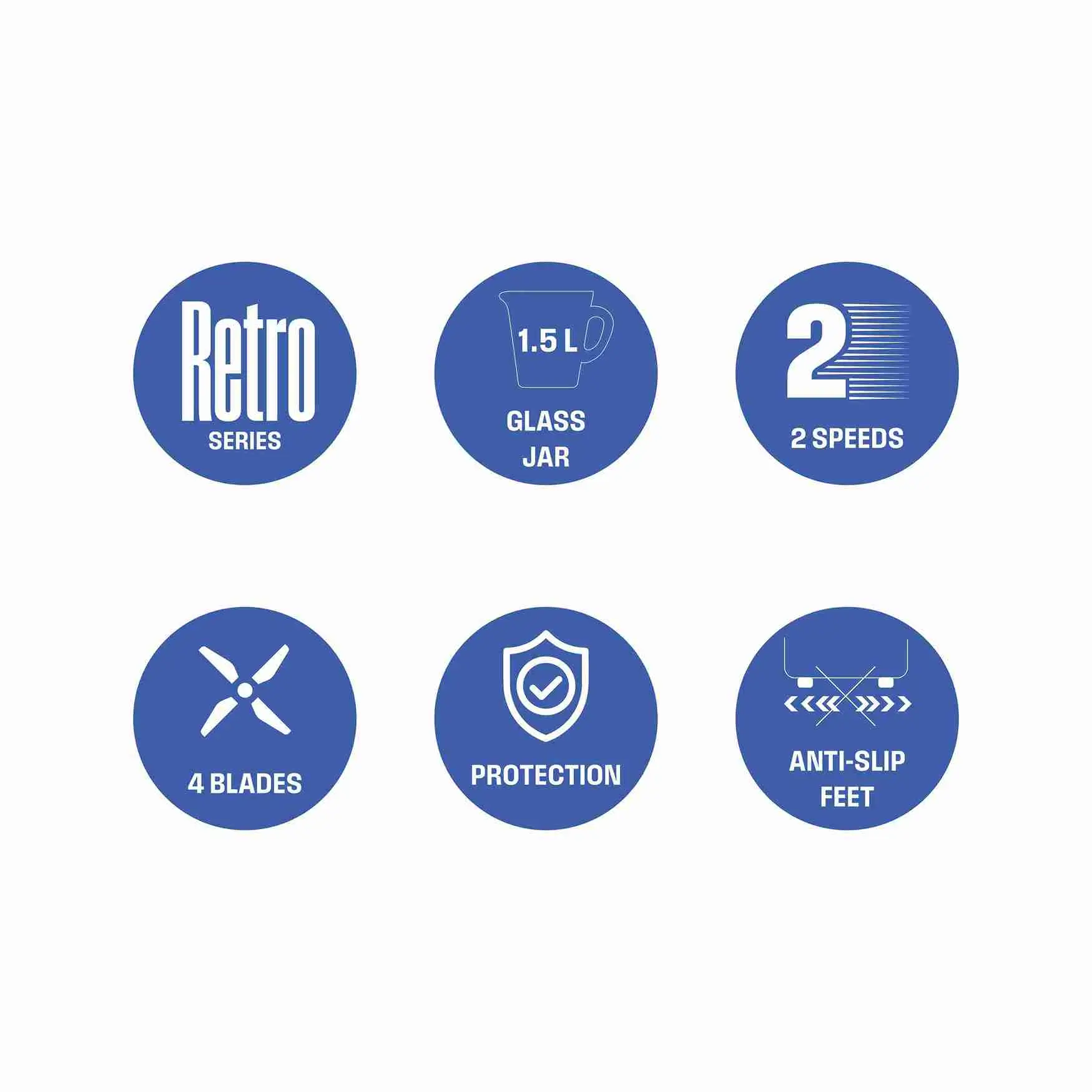 The Westinghouse Retro Table Blender with a 1.5L glass jar is built for everyday smoothies, juices, sauces, and purées with 3 speeds + pulse and an ice crush function. It features a safety lock to prevent operation unless assembled correctly and overheat protection for added reliability. Rated 220–240V~ 50/60Hz, 600W.