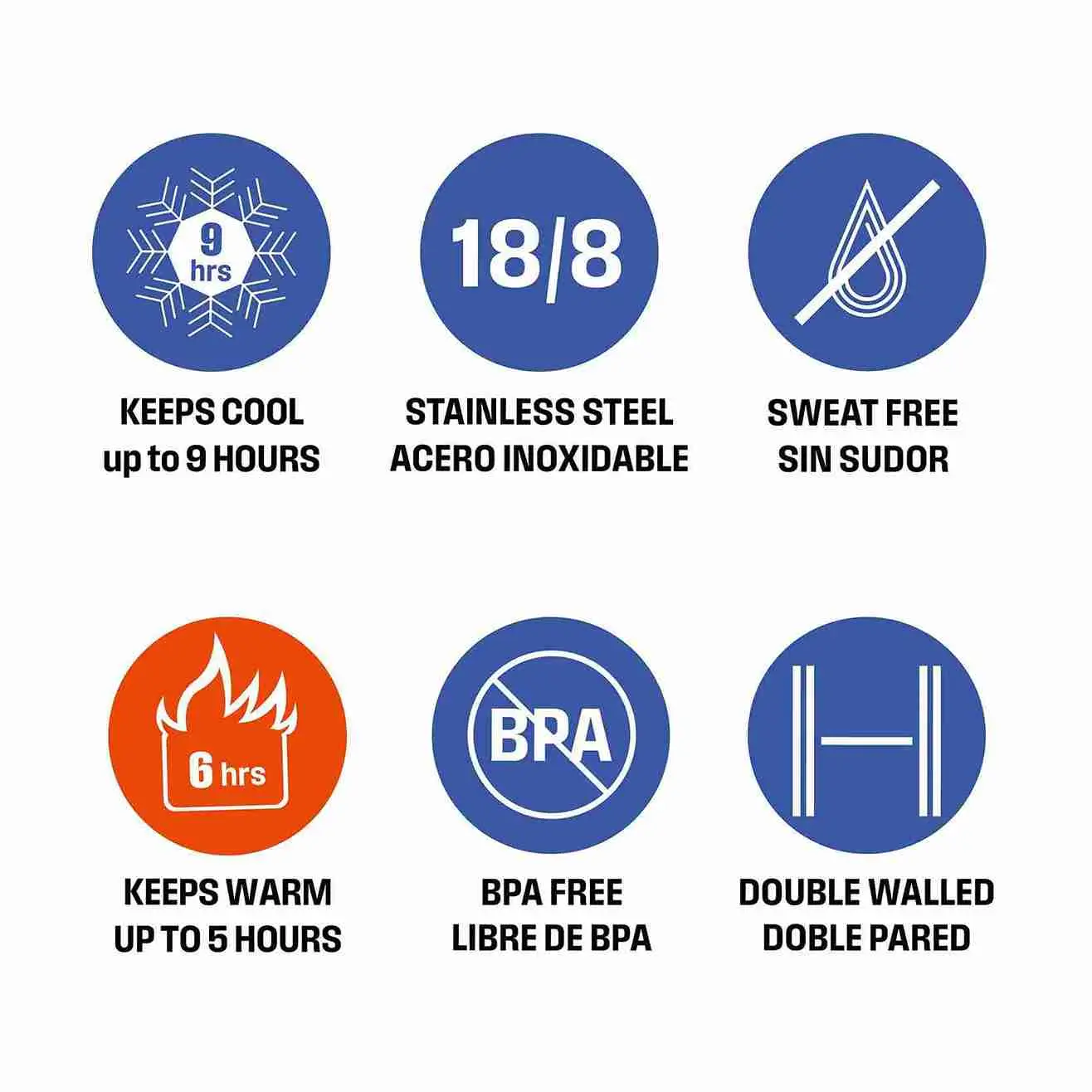 العزل المزدوج يساعد على تقليل فقدان الحرارة/البرودة، لذلك المشروب يفضل أقرب لدرجة الحرارة المفضلة لديك خلال ساعات العمل أو التمرين.