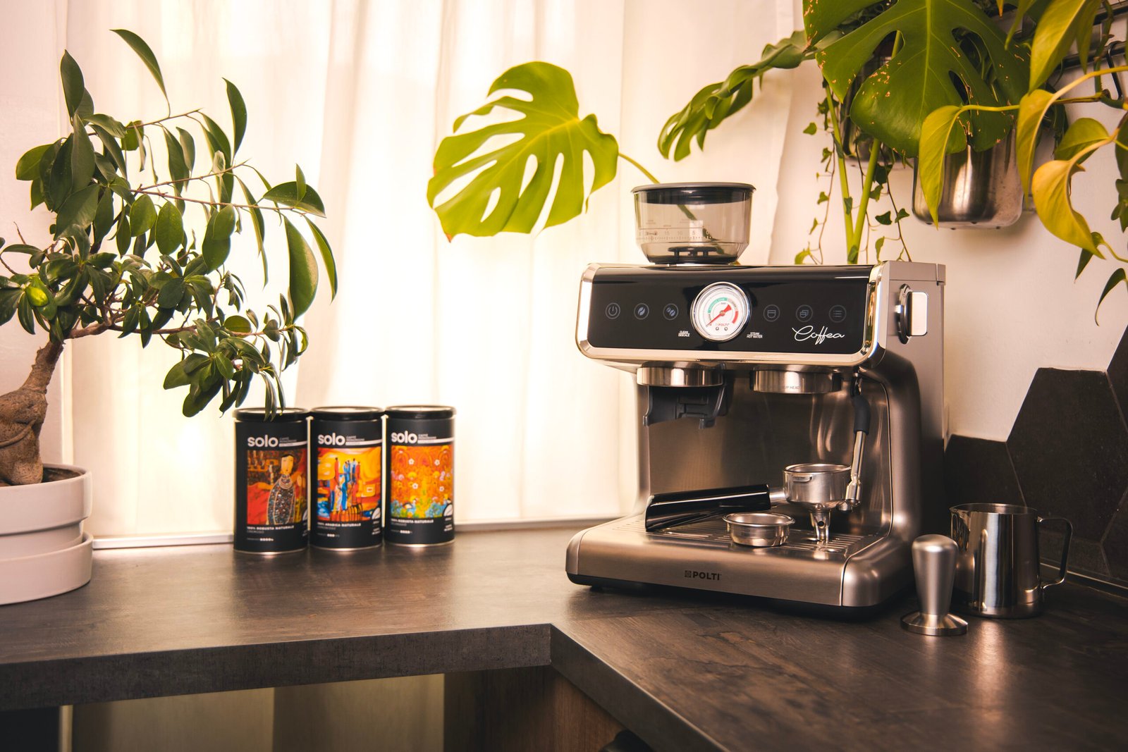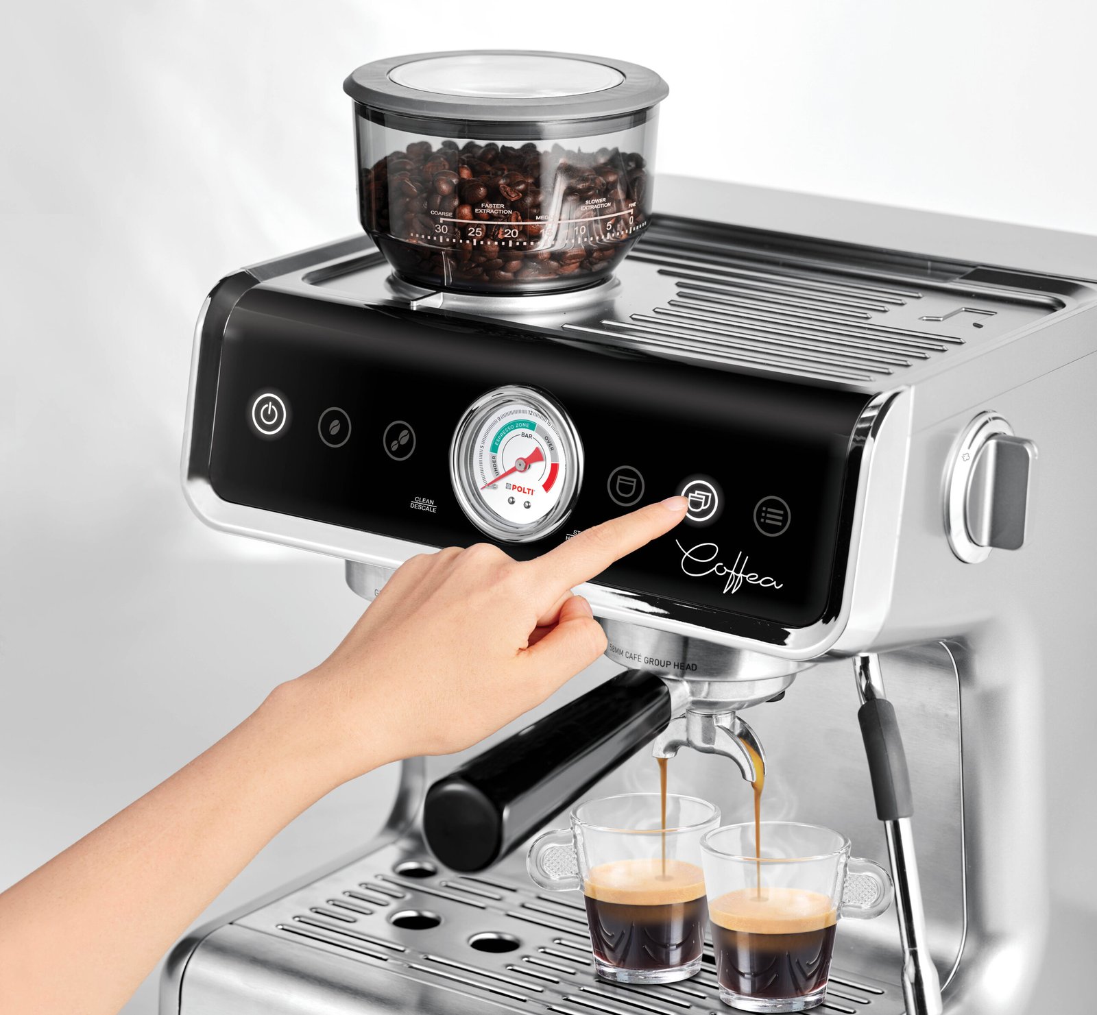 ماكينة Polti Coffea G50S مصممة لعشاق الإسبريسو اللي يحبّوا يتحكموا في كل تفاصيل التحضير: من درجة الطحن وحتى حرارة القهوة وطول الاستخلاص.