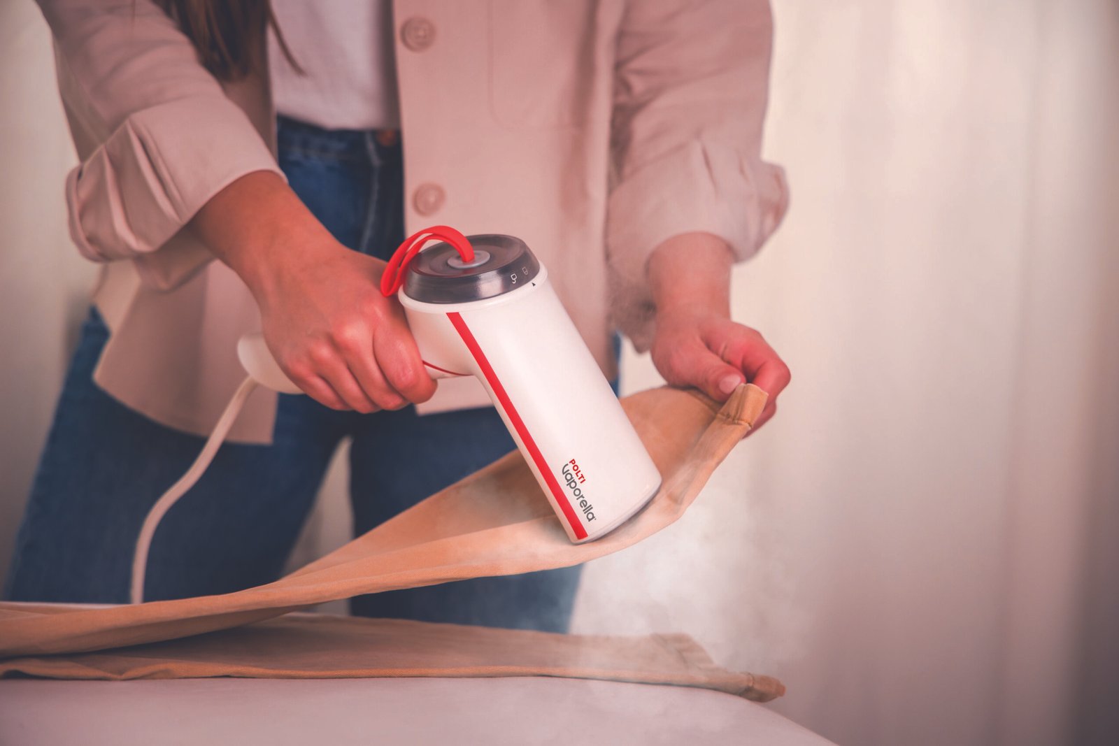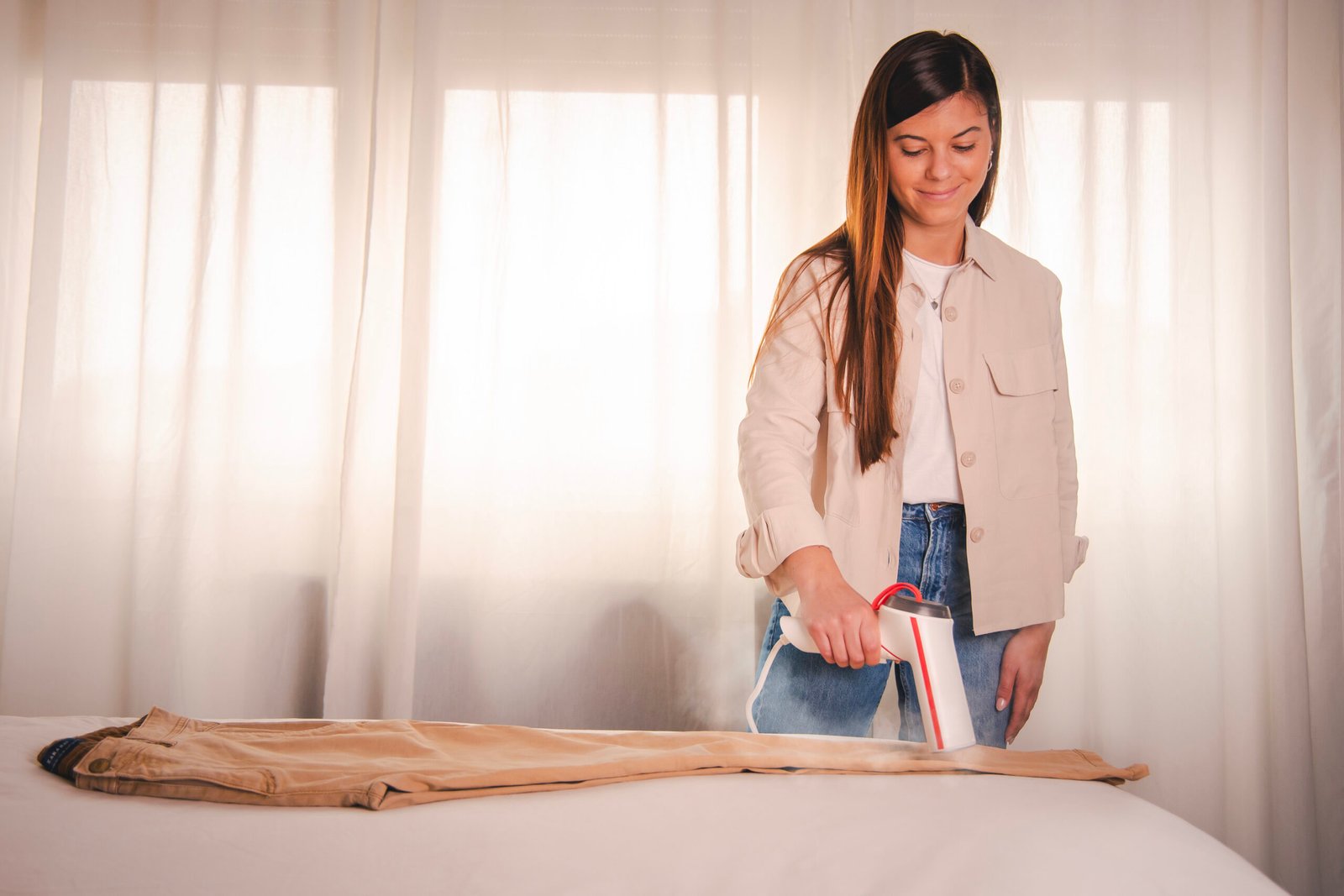 لا تحتاج إلى لوح كي؛ يكفي استخدام علاقة أو حامل لتبخير الملابس وهي معلّقة، ما يقلل وقت التحضير والمساحة المطلوبة.